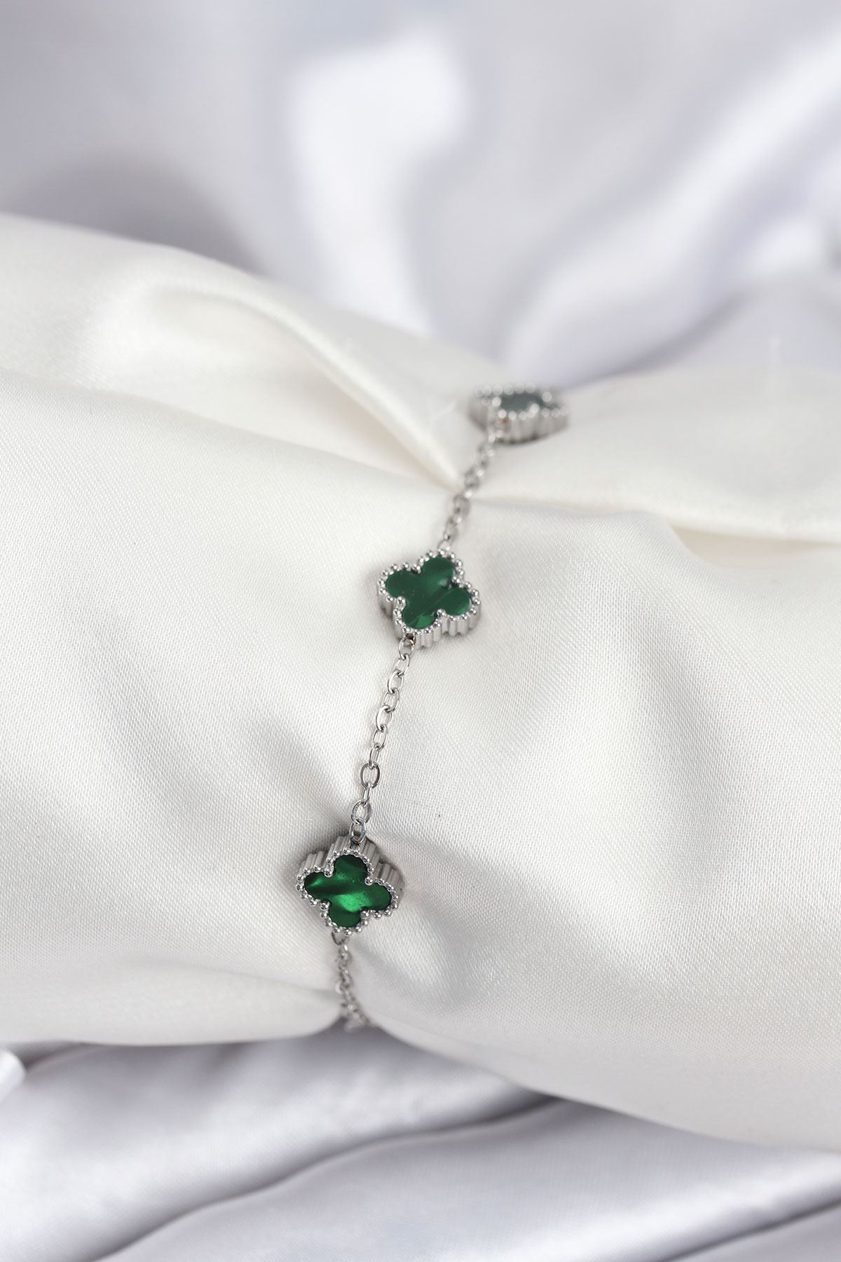 316L Çelik Zincir Gümüş Renk Zirkon Taşlı Yonca Beyaz Kadın Bileklik