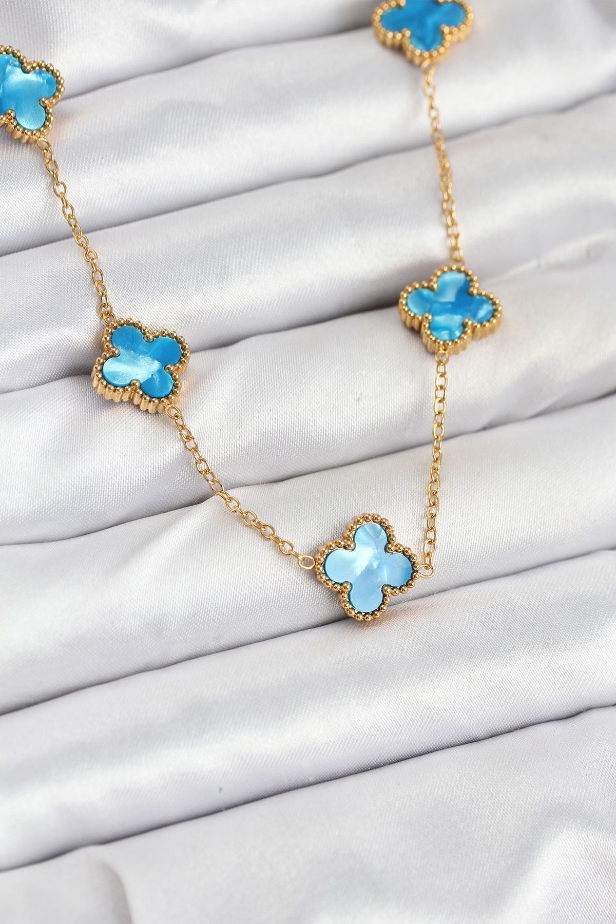 316L Çelik Zincir Gold Renk Lacivert Yonca Kadın Kolye