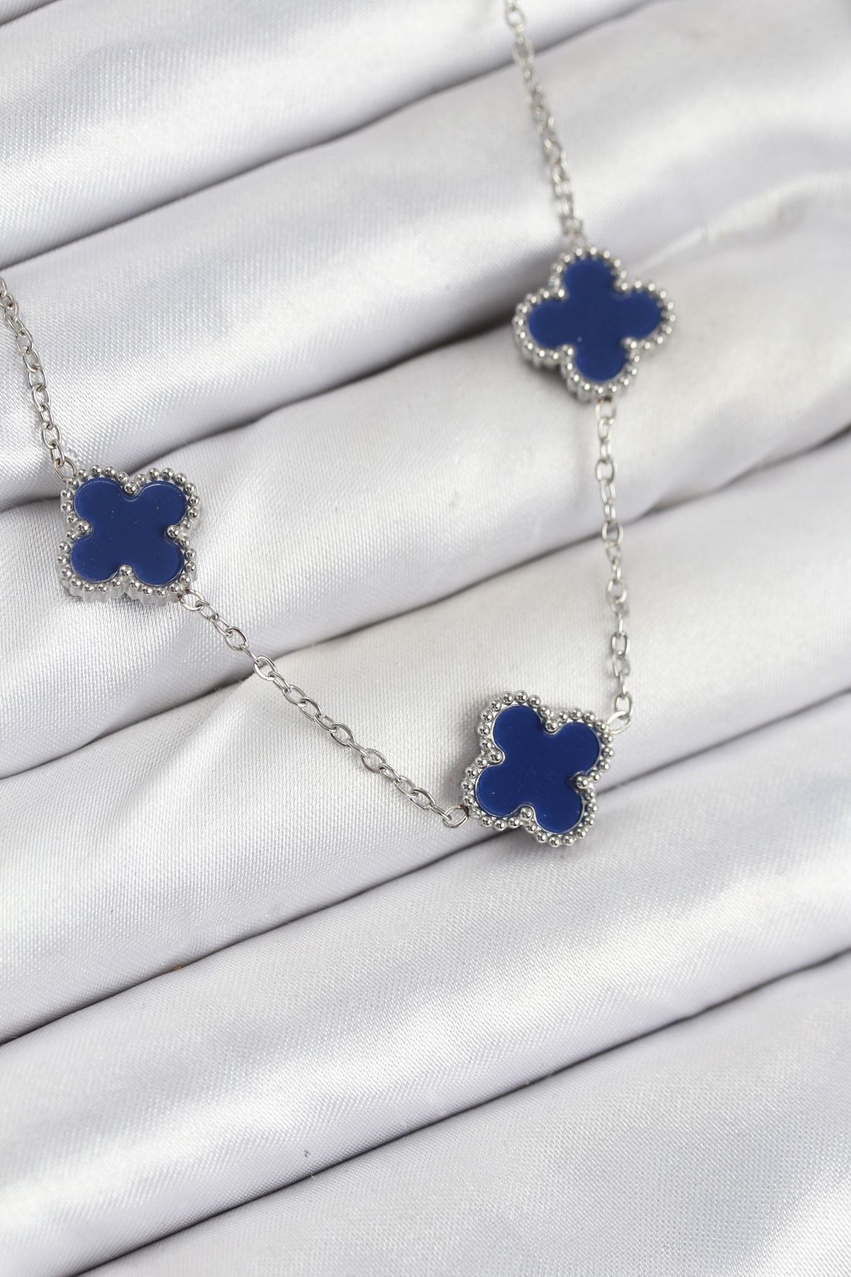 316L Çelik Zincir Gümüş Renk Lacivert Baby Boy Yonca Kadın Kolye
