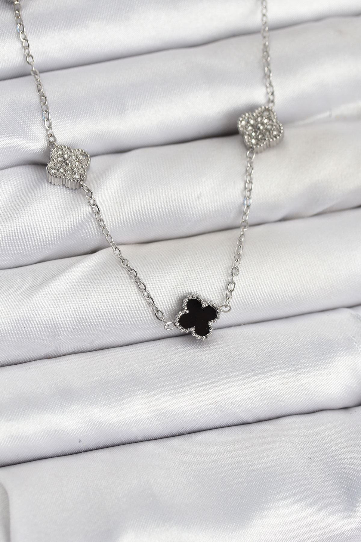 316L Çelik Zincir Gümüş Renk Beyaz ve Zirkon Taşlı Yonca Kadın Kolye
