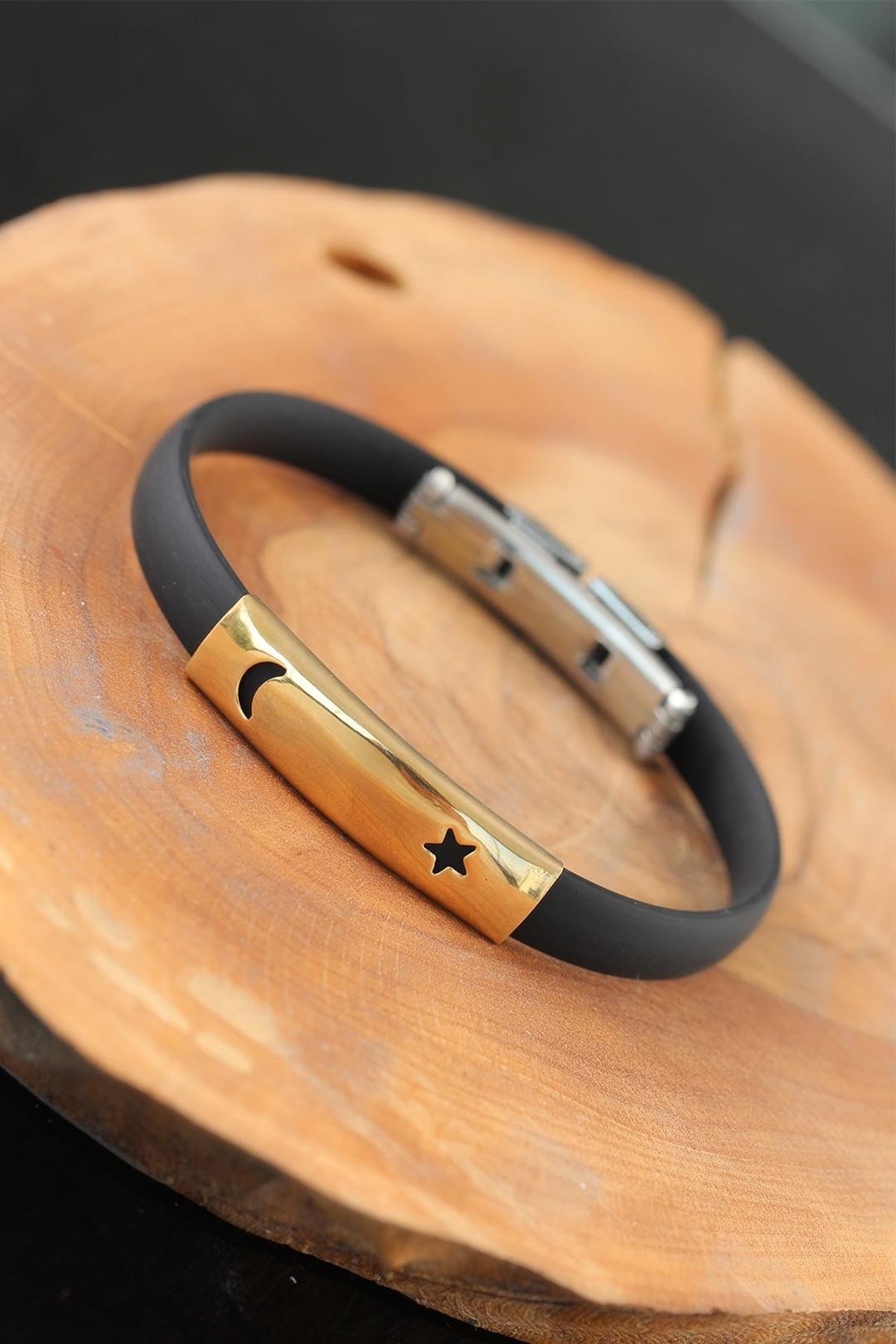Şıklığa Gold Renk Metal Ay Yıldız Tasarım Siyah Renk Silikon Erkek Bileklik ile adım atın.